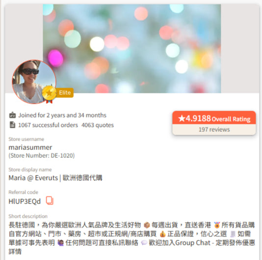 我長駐德國多年,熱愛發掘歐洲在地好物與新興品牌,擁有德國商業註冊。經營近三年來,我們始終秉持誠信,承諾貨品 100% 採購自官方門市、網店、藥房及大型超市,保證正品,讓您安心購物。